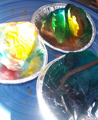 The front middle one is one I did by drawing on the egg in bees wax crayon and then soaking in a dye bath. The front left is one Nienna did using the tie-dye method.